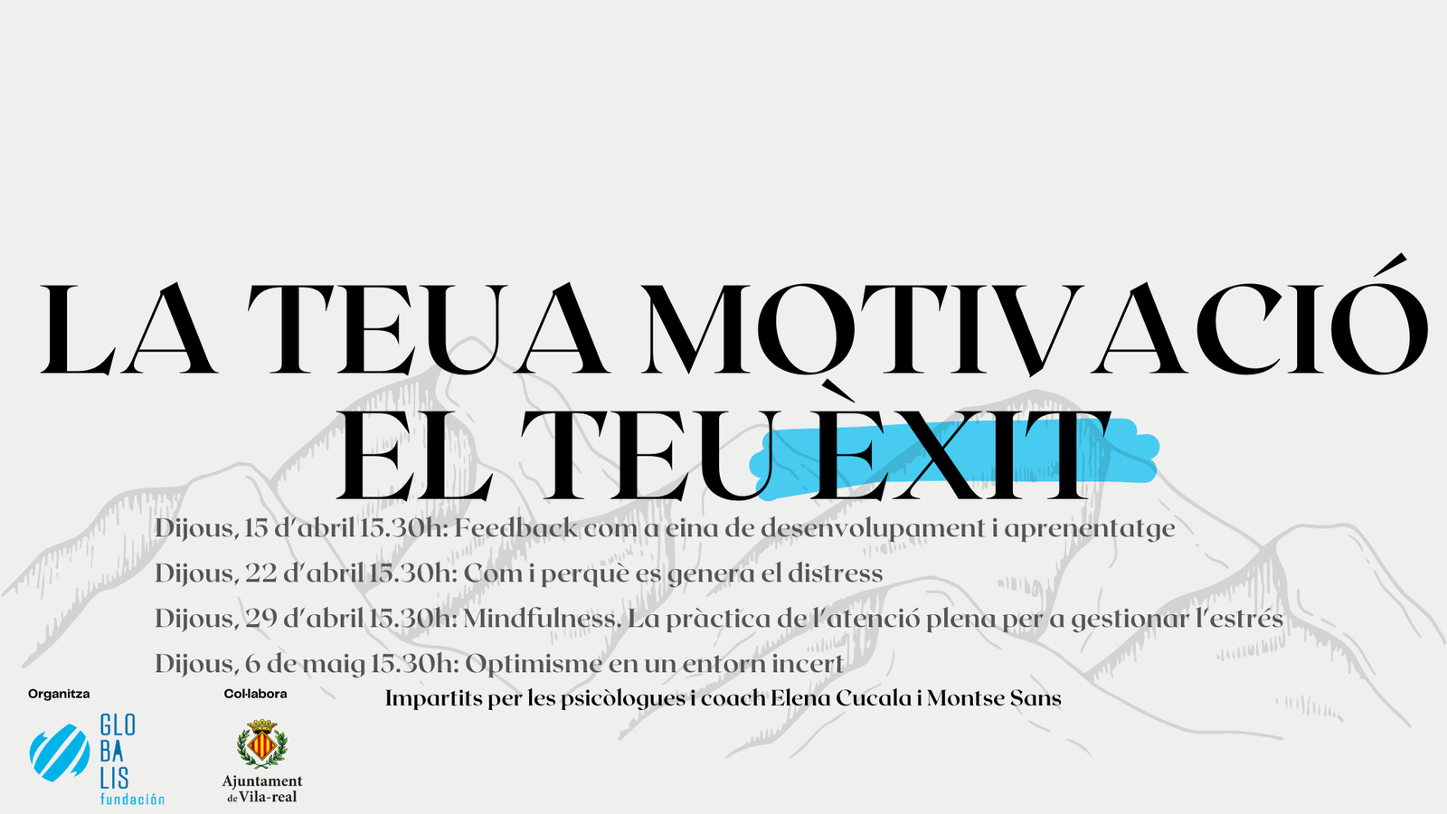 “La Teua Motivació, El Teu Èxit” organitzat per Fundació Globalis amb la col·laboració de l’Ajuntament de Vila-real, és un projecte que es compon de 4 webinars impartits per les psicòlogues i coach, Elena Cucala i Montse Sans.